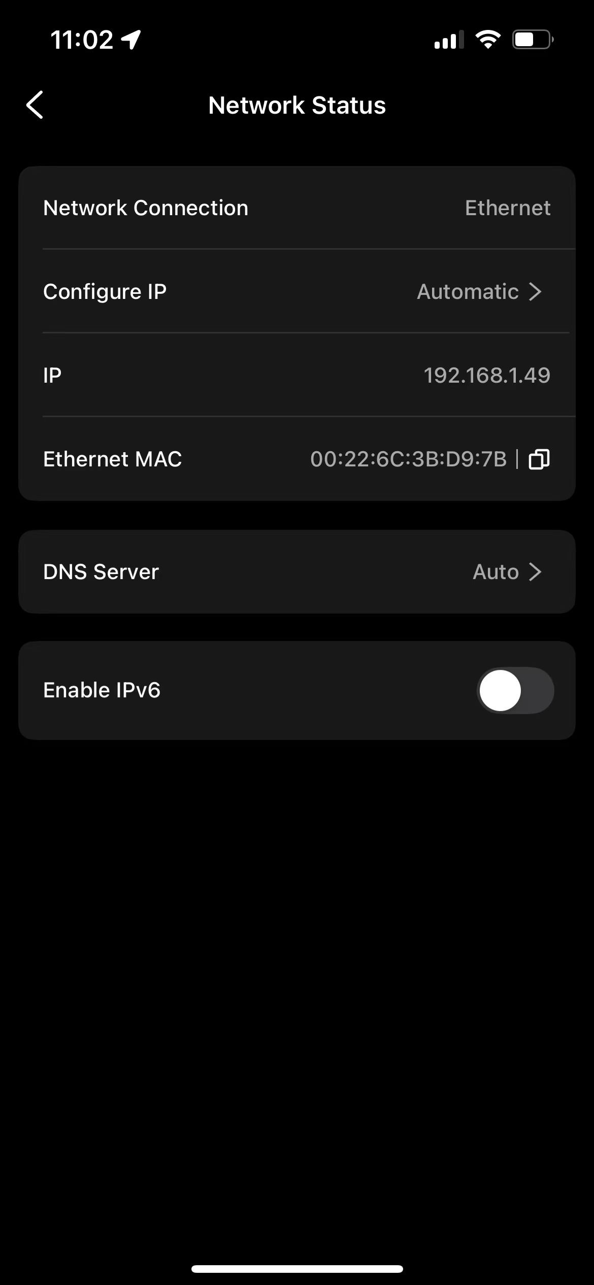 You can check the current network connection status in the WiiM Home app by going to Device Settings > Network Status.