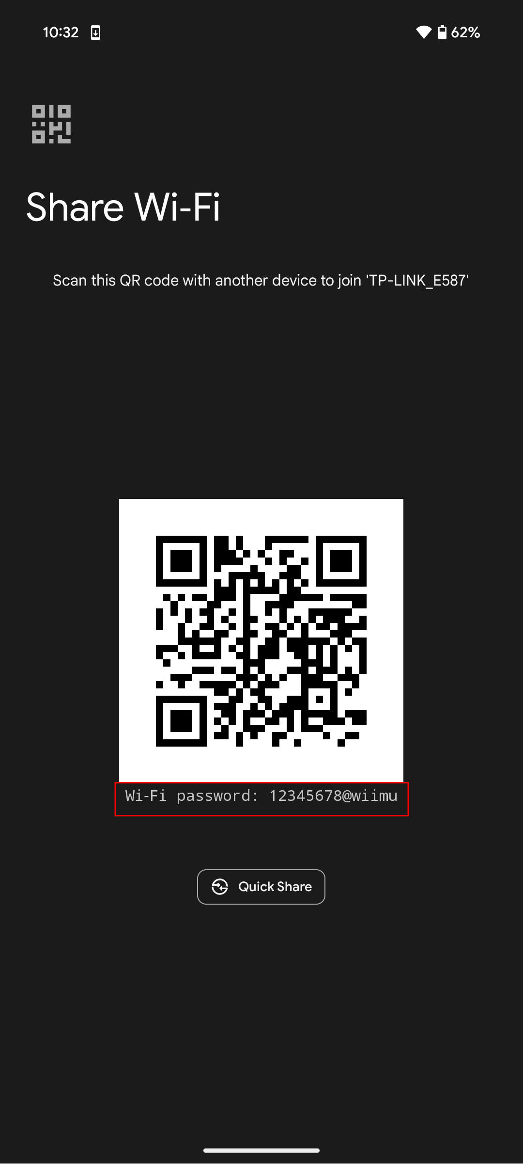- You will be prompted to authenticate using your PIN, pattern, or fingerprint. After authentication, a QR code will appear, along with the Wi-Fi password below it.
