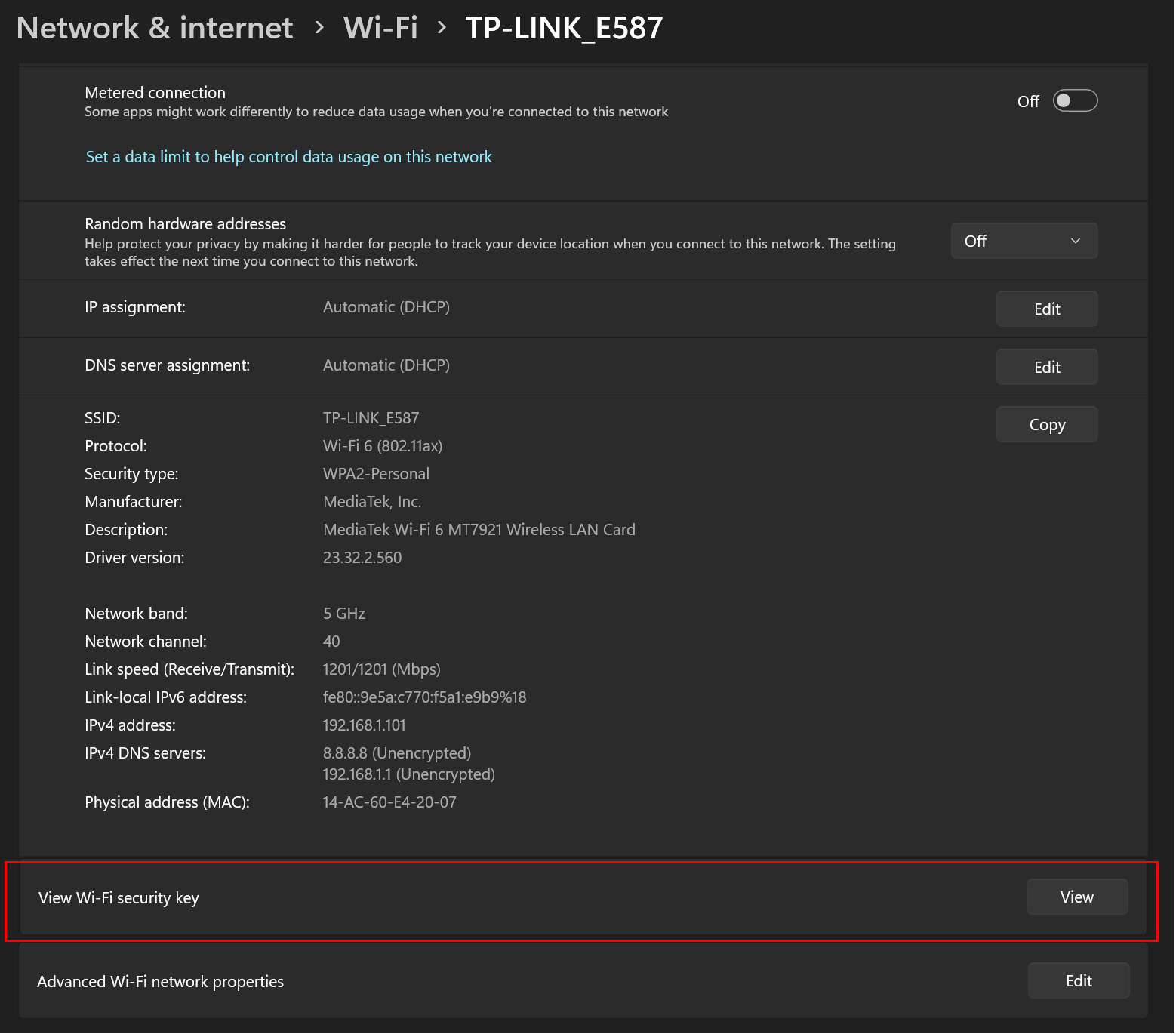 - Scroll down to the View Wi-Fi security key section and click View. A new window will open, displaying your Wi‑Fi password.