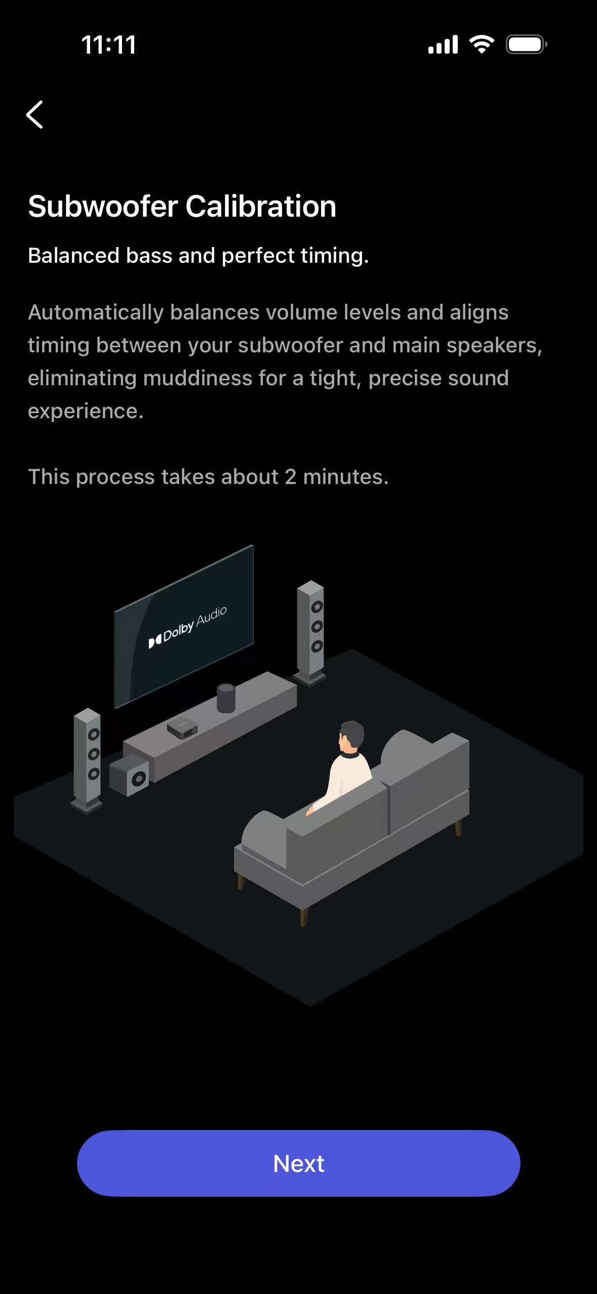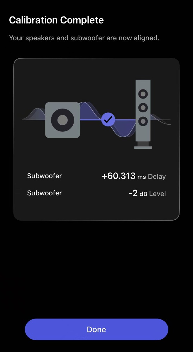 The calibration process uses your phone's microphone to automatically measure and align the time delay and volume level.