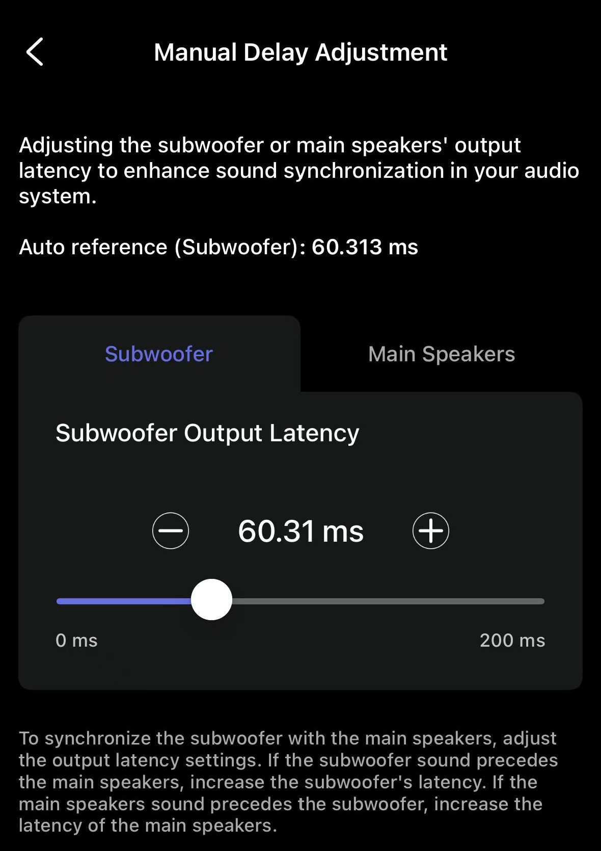 If your subwoofer uses digital signal processing (DSP), it most likely introduces processing delay. Unfortunately, this delay cannot be eliminated. To compensate, you can add delay to the main speakers using the WiiM Home app.