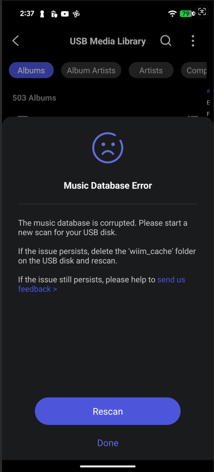 When a USB disk error occurs, preventing the scanning process from proceeding, the following error message will pop up in the WiiM Home app.