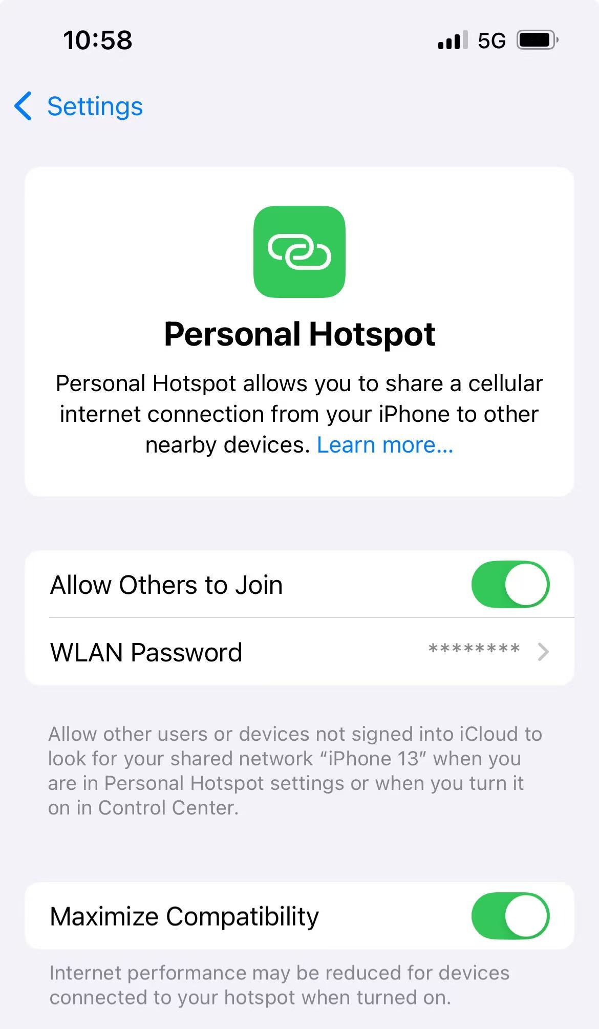 For iPhone/iPad Users: - Keep the Personal Hotspot page open so your WiiM device can detect the hotspot. - Enable Maximize Compatibility to ensure a successful connection.