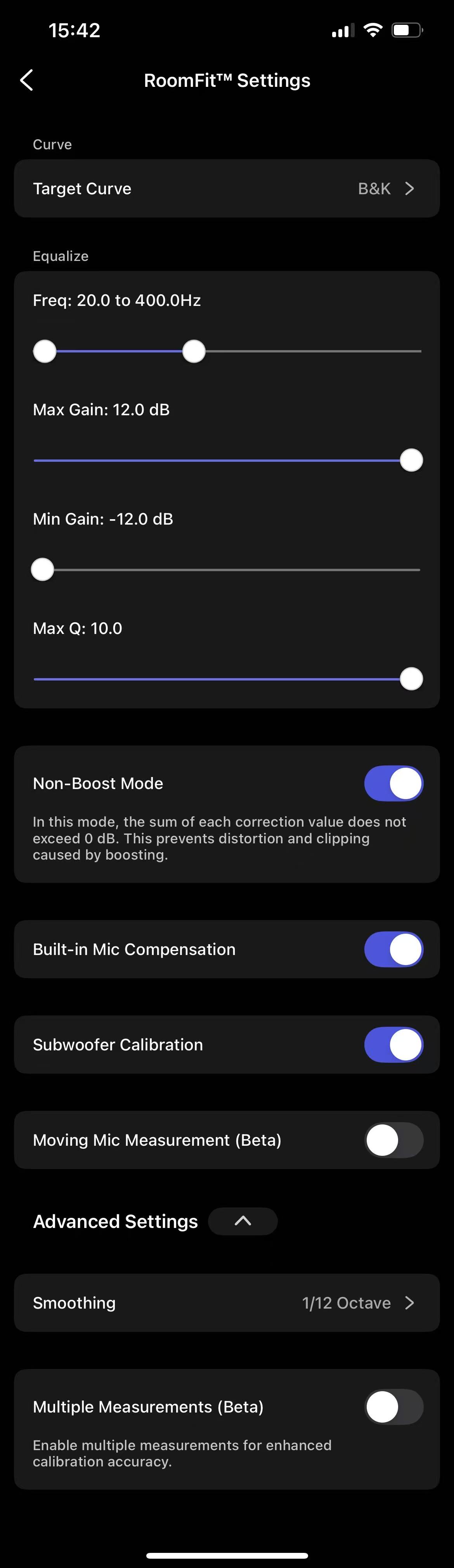 ![]() | Target Curve: B&K Freq: 20 Hz to 400 Hz Note: If your subwoofer does not reach 20 Hz, use the lower frequency limit specified in the subwoofer’s specification sheet instead. Max Gain: 12 dB Min Gain: -12dB Max Q:10 (if no EQ boosts or positive filters are applied) Max Q: 5(if you want to be more conservative) Note: Using 5 will make the adjustments less precise in reducing resonance peaks. Non-Boost Mode: Enabled Subwoofer Calibration: Enabled (if using a subwoofer) Smoothing: 1/12 octave Multiple Measurements (Beta): Disabled Other Settings: