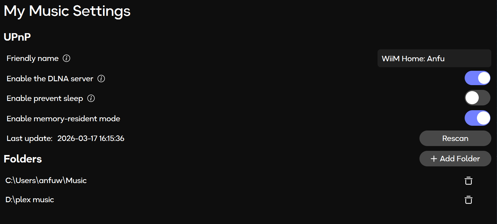 Note: The WiiM Home app automatically adds the default music folder on macOS (~/Music) and Windows (C:/Users/<USER>/Music).