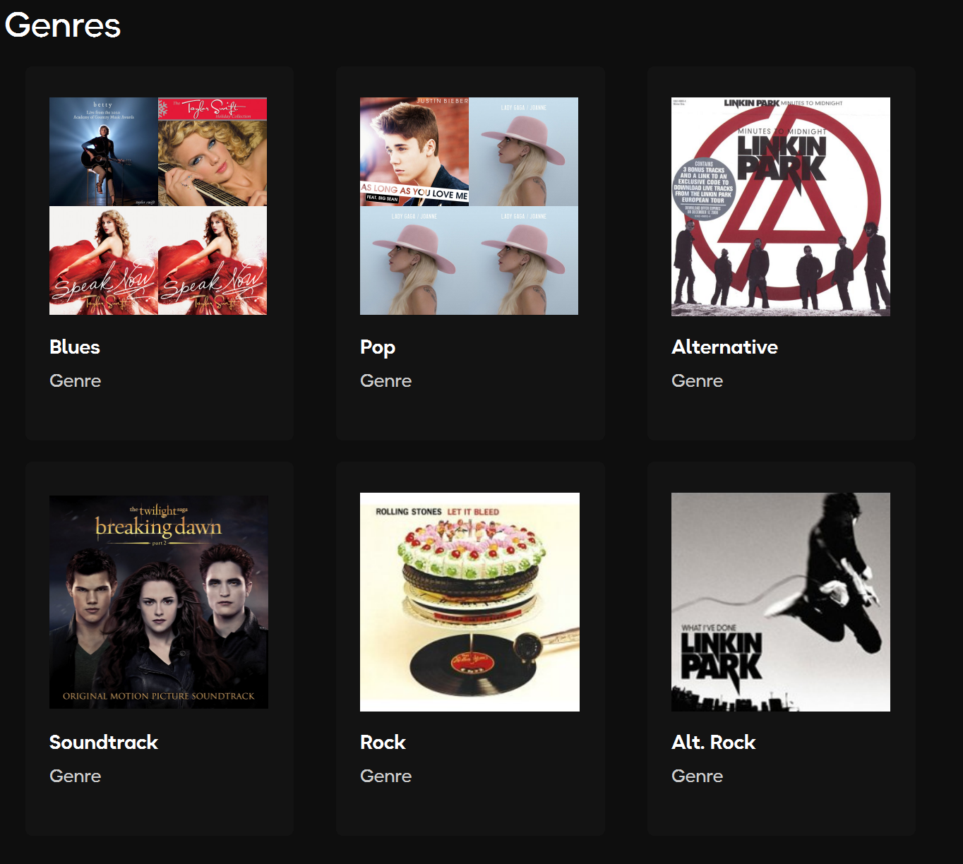 The Genres page categorizes your music by genre, such as Blues, Pop, Rock, and more. Simply tap a genre to view the tracks under that category.