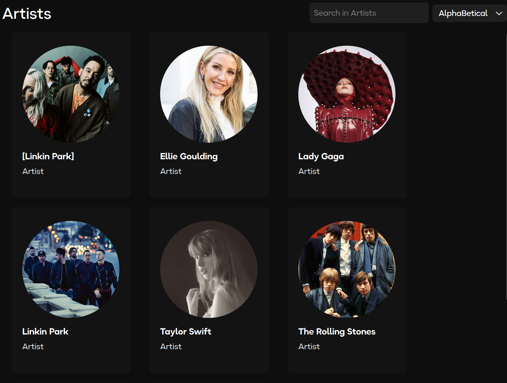 The Artists page displays a collection of artists from your music library. You can search for specific artists or sort them alphabetically.