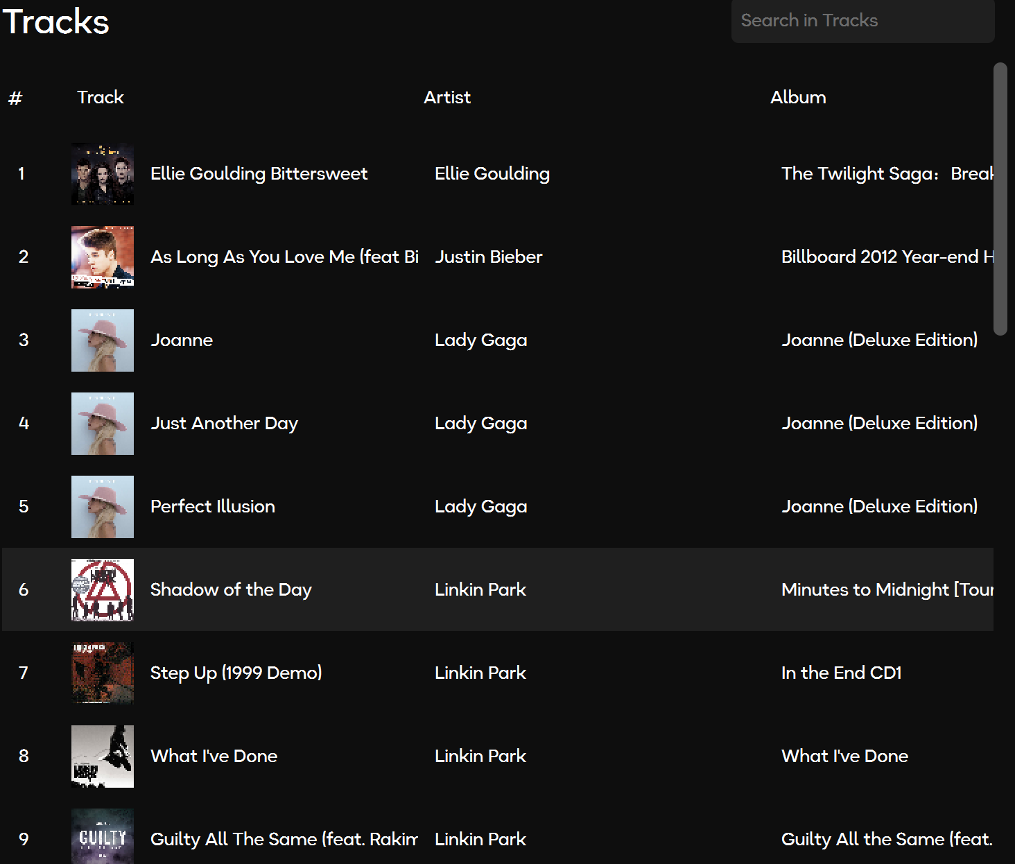 The Tracks page lists all the individual tracks in your music library. You can easily browse through the tracks or search for specific ones within the library.