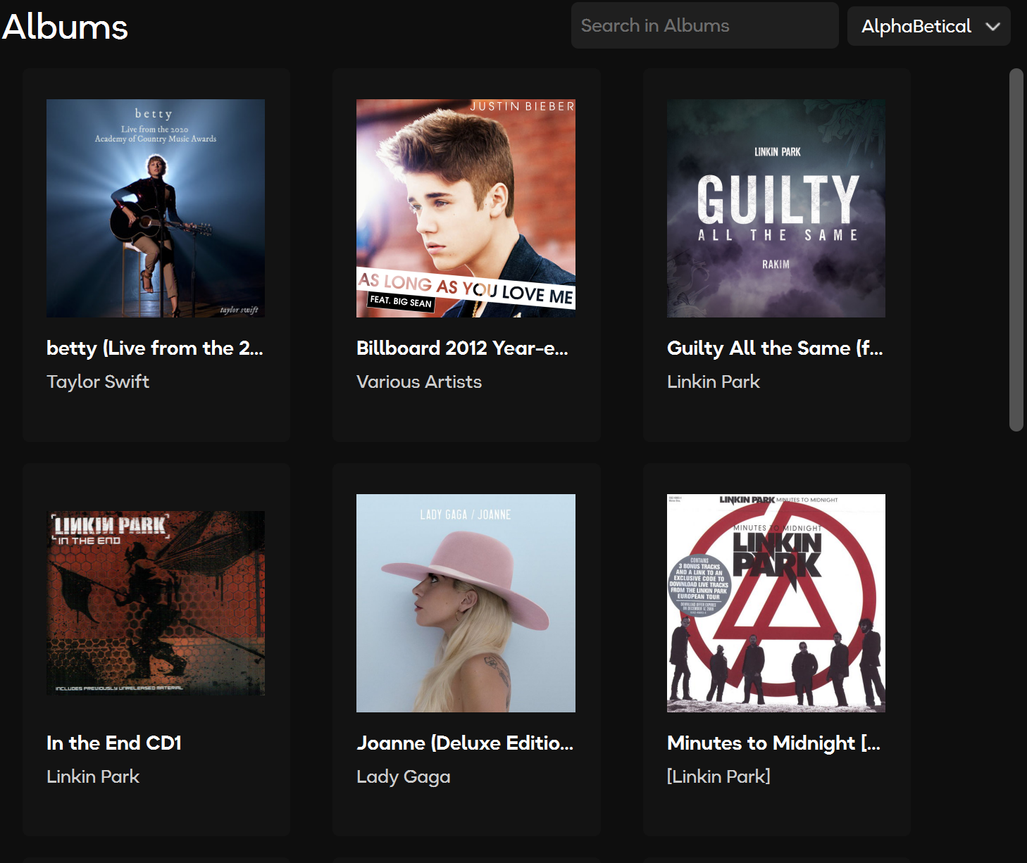 The Albums page organizes your music by individual albums. You can search for specific albums and sort them alphabetically.