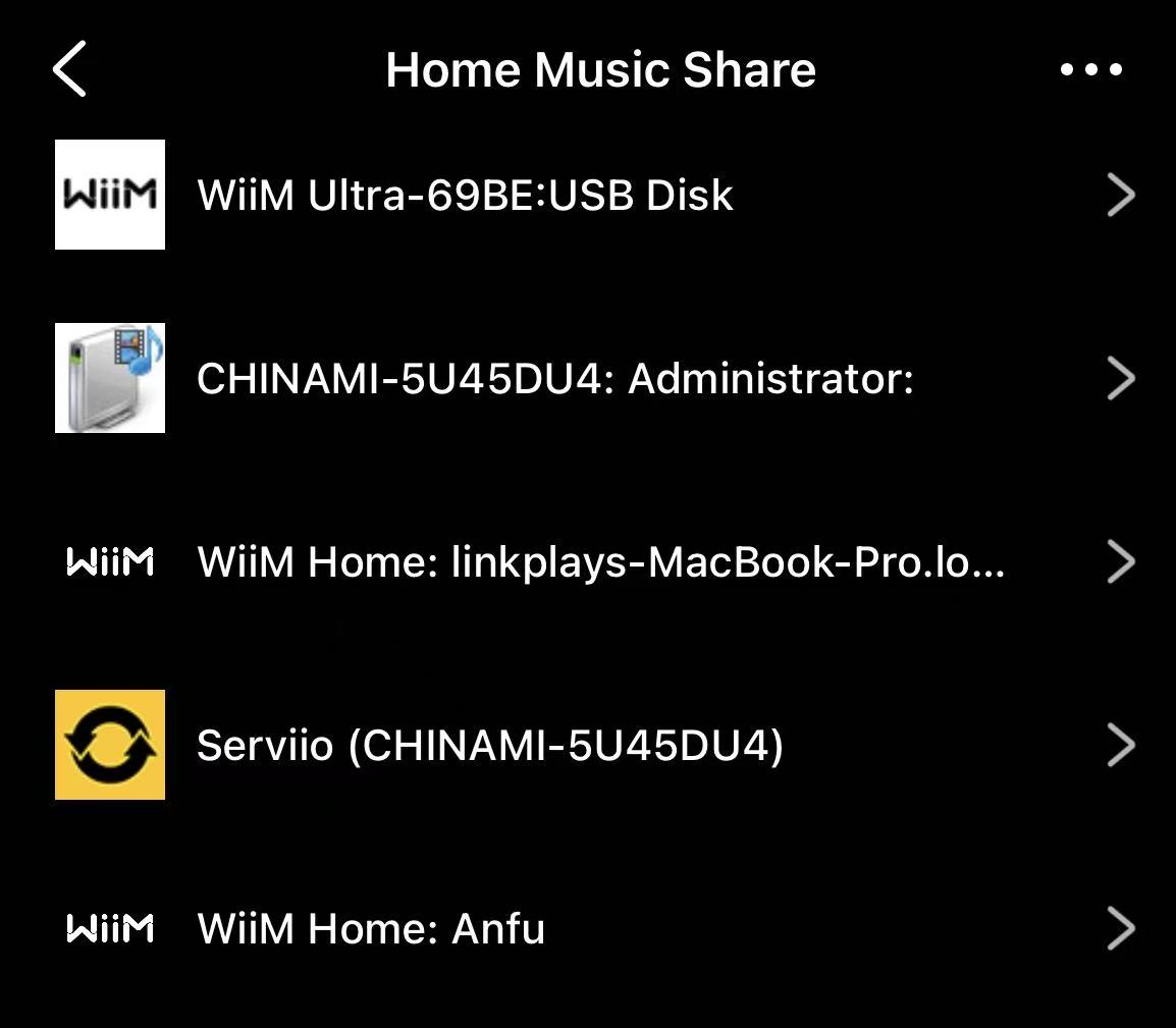 To access the media server, simply open the WiiM Home app on your mobile device, go to the Home Music Share section, and you'll find the media server in the list. For detailed instructions, refer to Building and Managing a Media Library from Your Media Server.