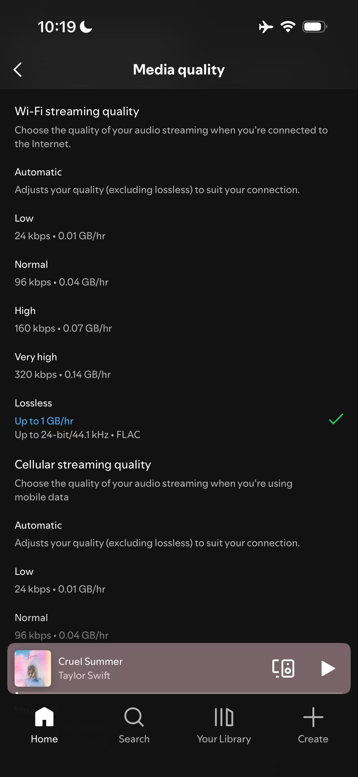 - Choose Lossless for both Wi-Fi streaming quality and Cellular streaming quality.