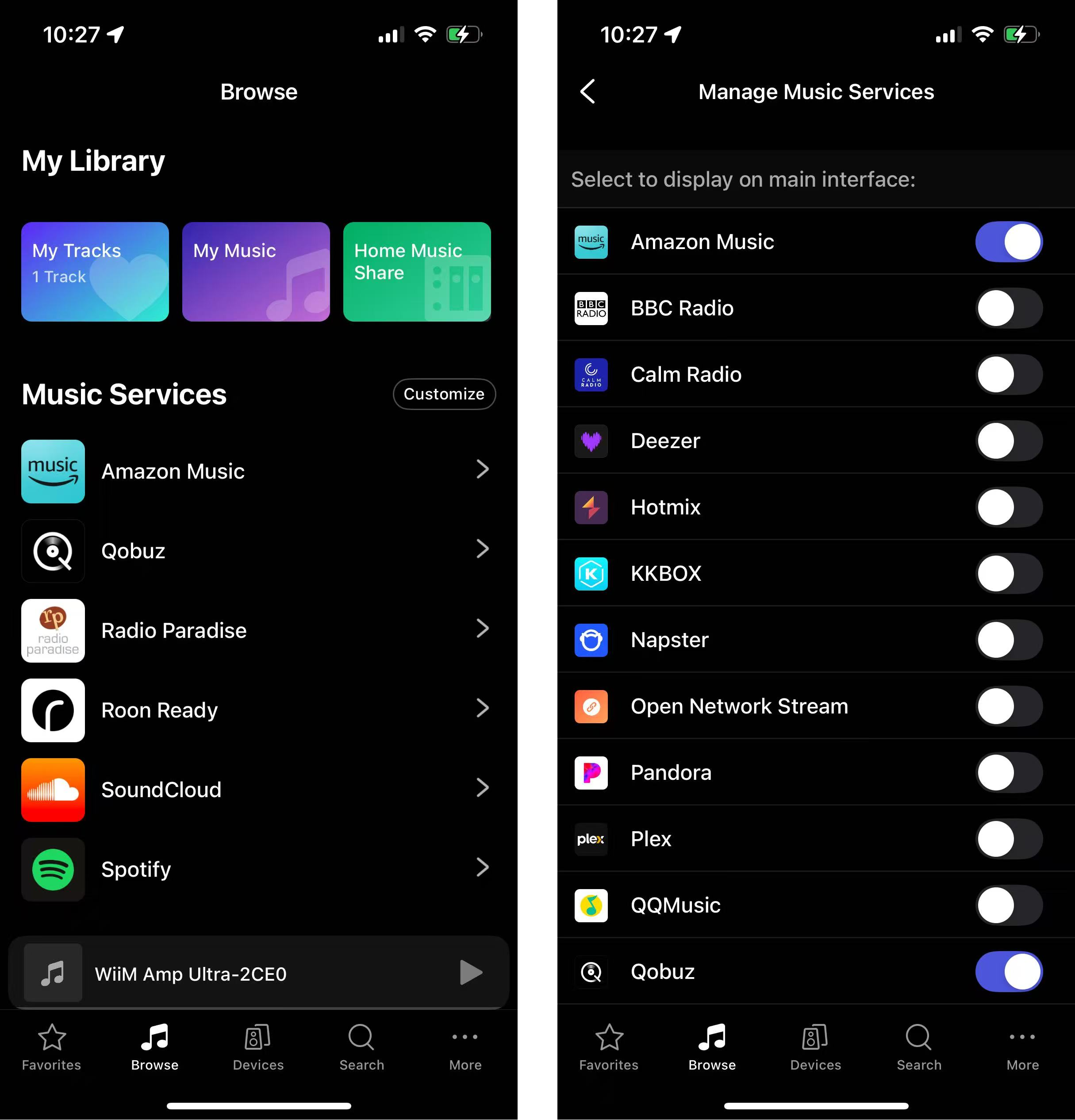 The WiiM Home app integrates popular music services, letting you browse and play music directly in the app without switching apps.