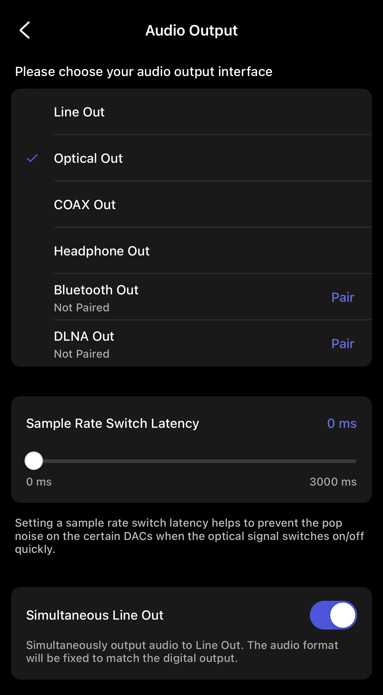 WiiM now features Simultaneous Line Out. When Optical Out or COAX Out is selected, you can enable this feature to output audio through the Line Out port simultaneously. This creates a synchronized, dual-zone listening experience from a single device—without wireless grouping delays.