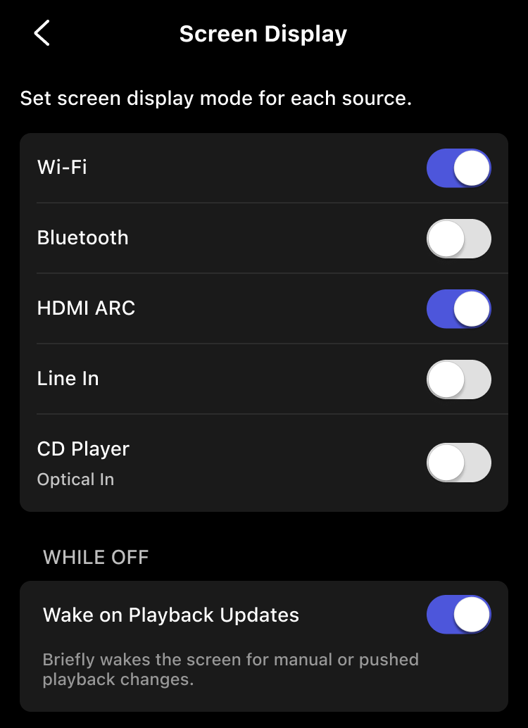 This allows you to customize screen behavior for different usage scenarios—for example, keeping the screen on while streaming music via Wi-Fi, but turning it off when using TV via HDMI ARC to avoid distractions.